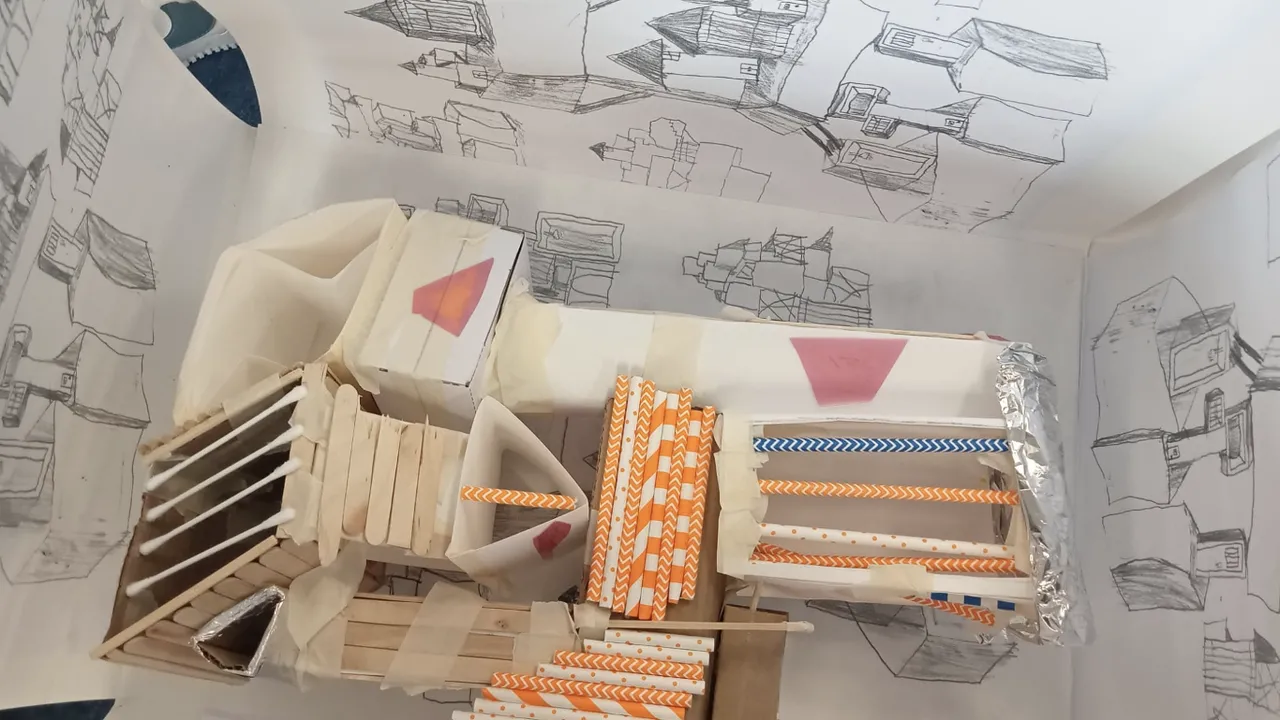 'Isolation' consists of cubicles, each made from different materials that can be found in a normal household, such as aluminium foil, cardboard, ice lolly sticks, straws and plastic. These stacked and separated cubicles symbolise isolation and loneliness. The cubicles closely resemble prison cells and are positioned in such a way that they form a tilting tower, inspired by the style of Jimi Kleinbruinink.