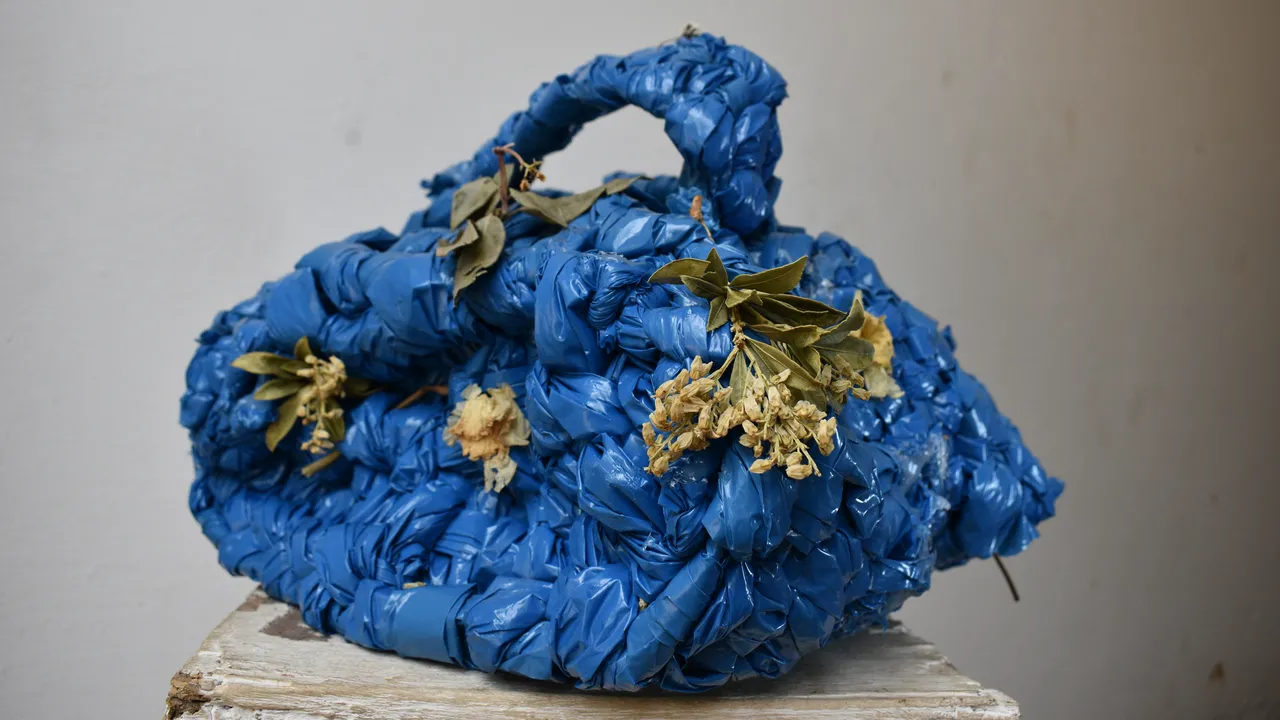 We made a bag from recycled plastic, using garbage bags, specifically blue ones, because blue is the color of the blue helmets. The blue helmets were the Dutch who said that the people in Srebrenica were ‘safe’. In addition, we chose to weave the bag in the African style, so that we could still maintain a connection with CATPC.